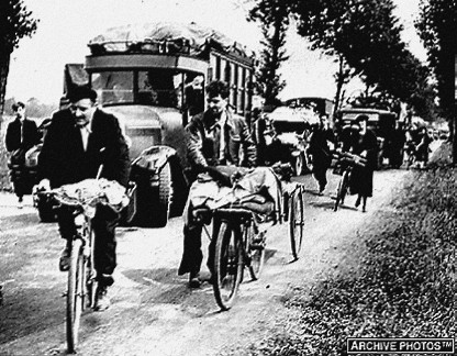 défilé de réfugiés, entre-coupé de matériel militaire et