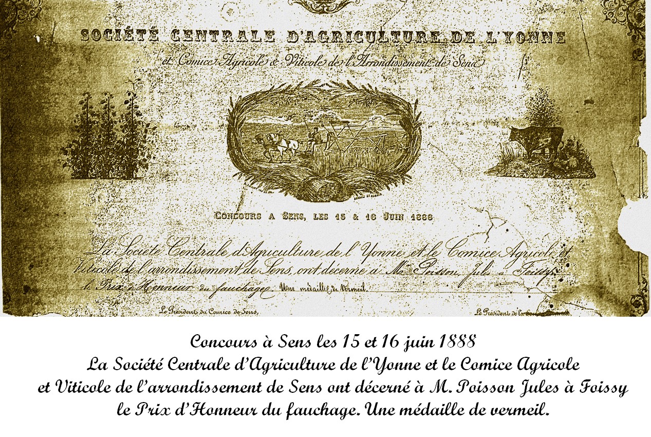 A M. Poisson Jules de Foissy le Prix d’Honneur du fauchage juin 1888