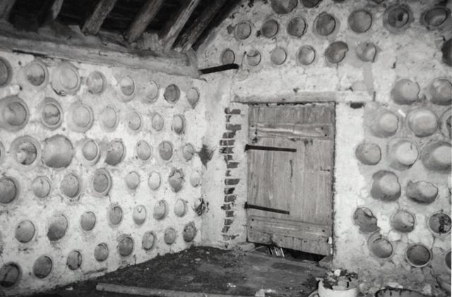 casserole fixée à un clou: elle servait à boire pour